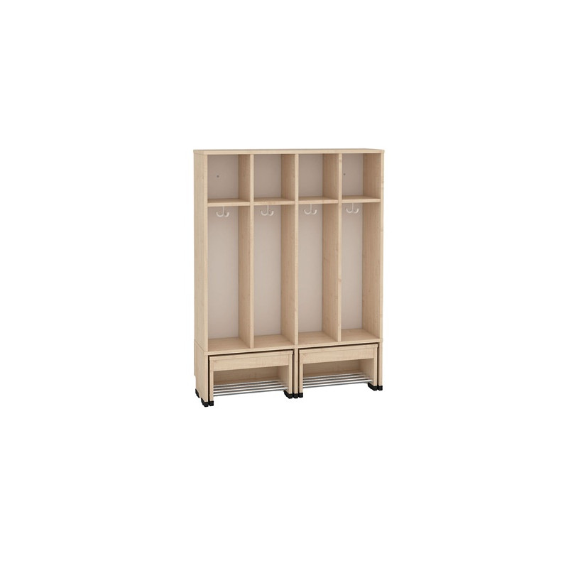 Realizzato in conglomerato nobilitato ligneo, finitura acero, spessore 18 mm. Bordi rifiniti in ABS antiinfortunistico. Ogni vano e corredato di un gancio triplo molto resistente e cappelliera. Dim. cm 101x28x134h. SH 26 cm
