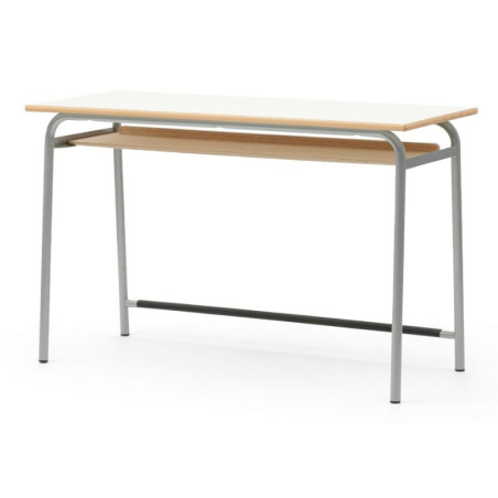 Struttura metallica formata da due coppie di montanti sagomati in tubo di acciaio a sezione tonda di mm 28x1,5 di spessore, collegata tramite 2 piastre in lamiera d’acciaio ad “L” che consentono il sostegno dei sottopiani. Lavorazione del tubo di acciaio con curvatura a freddo, saldato a filo continuo. Verniciatura con polveri epossidiche cotte in galleria termica a 220°C, previo sgrassaggio e fosfatazione in tunnel. Colore nero o blu. Piano di scrittura realizzato con pannello di conglomerato ligneo, spessore 20 mm., rivestito su entrambe le facce con laminato plastico melaminico colore avorio. Bordi in ABS colore faggio. I puntali in plastica antirumore. Dim. cm 120x50x76h. Certificato UNI EN 1729/1-2/2006.
