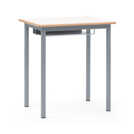 Struttura portante in metallo tubolare di mm 40x1,5 di spessore, costituita da 4 montanti collegati perimetralmente sotto il piano tramite tubolari a sezione rettangolare mm 40x20x1,5. Le saldature delle parti metalliche sono eseguite a filo continuo con sistema robotizzato e successiva spazzolatura. Verniciatura con polveri epossidiche cotte in galleria termica a 220°C, previo sgrassaggio e fosfatazione in tunnel. Piano di scrittura realizzato con pannello di conglomerato ligneo, spessore 20 mm, rivestito su entrambe le facce con laminato plastico melaminico colore faggio o magnolia, classe E1, ignifugo classe 2. Bordi in ABS colore faggio. Il gancio porta zaino (optional) è saldato alla struttura portante non sporgente dal piano di scrittura. I puntali sono in plastica antirumore. Il fissaggio del piano alla struttura, avviene con viti autofilettanti passanti in un foro ricavato nelle alette di lamiera stampata, saldata all'interno del perimetro del telaio posto sotto il piano. Completo di sottopiano in lamiera. Dim. cm 70x50x59h. Certificato UNI EN 1729/1-2/2006.