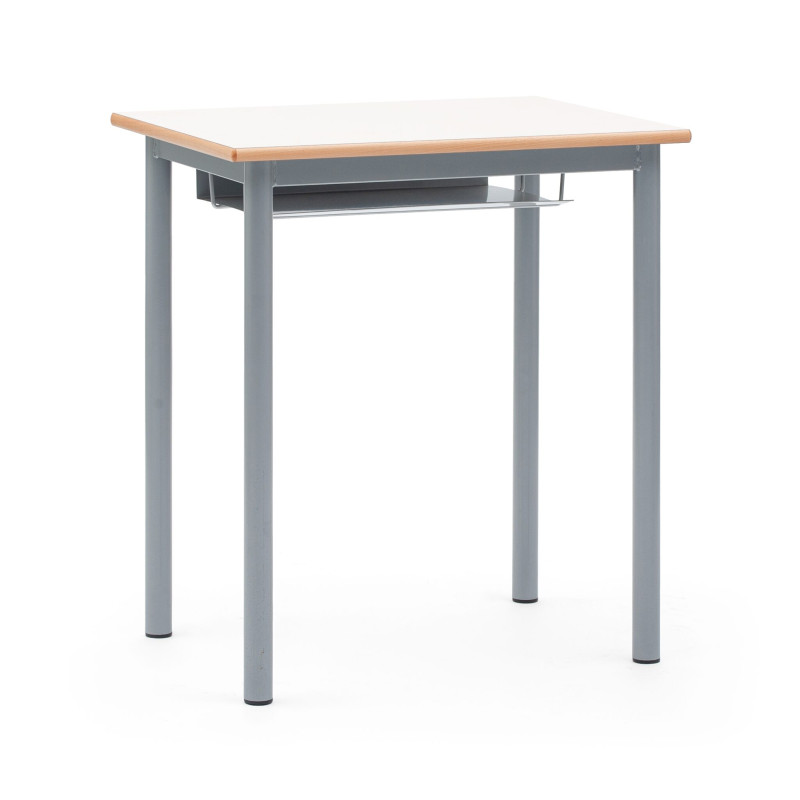 Struttura portante in metallo tubolare di mm 40x1,5 di spessore, costituita da 4 montanti collegati perimetralmente sotto il piano tramite tubolari a sezione rettangolare mm 40x20x1,5. Le saldature delle parti metalliche sono eseguite a filo continuo con sistema robotizzato e successiva spazzolatura. Verniciatura con polveri epossidiche cotte in galleria termica a 220°C, previo sgrassaggio e fosfatazione in tunnel. Piano di scrittura realizzato con pannello di conglomerato ligneo, spessore 20 mm, rivestito su entrambe le facce con laminato plastico melaminico colore faggio o magnolia, classe E1, ignifugo classe 2. Bordi in ABS colore faggio. Il gancio porta zaino (optional) è saldato alla struttura portante non sporgente dal piano di scrittura. I puntali sono in plastica antirumore. Il fissaggio del piano alla struttura, avviene con viti autofilettanti passanti in un foro ricavato nelle alette di lamiera stampata, saldata all'interno del perimetro del telaio posto sotto il piano. Completo di sottopiano in lamiera. Dim. cm 70x50x82h. Certificato UNI EN 1729/1-2/2006.