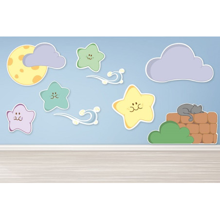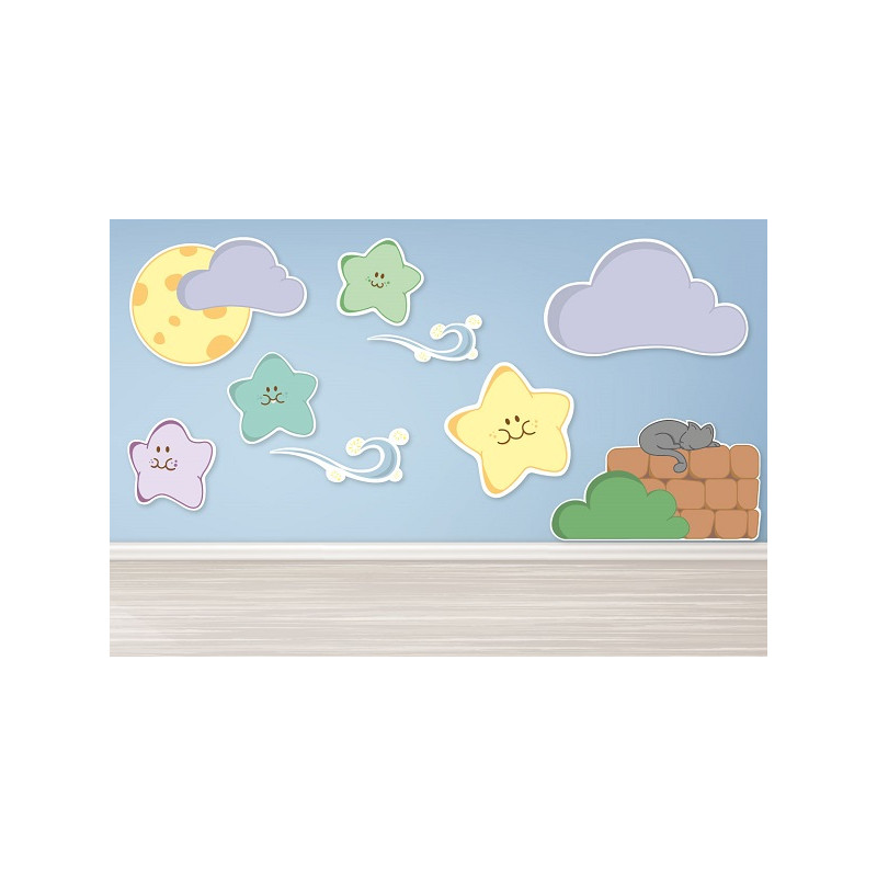 Splendida scenografia che renderà unico lo spazio dedicato alla nanna. Realizzata in Communication, viene applicata a parete tramite colla a caldo. È composta da 9 elementi: una luna piena semicoperta da una nuvola, un muretto sopra al quale riposa un dolce gattino accanto ad un cespuglio, una nuvola grande, una deliziosa stella celeste che si distingue per il suo scintillante dentino, altre 3 simpatiche stelle, una lilla, una gialla ed una verde e 2 sbuffi di vento, uno grande ed uno piccolo.