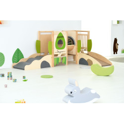 Realizzato in legno multistrato di betulla, decorato in tema floreale, verniciato con colori naturali ed atossici. L'angolo è dotato di un materasso ad onda sul quale i bambini possono scivolare ed arrampicarsi, di una finestra in plexiglass.Sotto la finestra si trova un labirinto manipolativo con foglie piene di campanelli che stimolano il senso del tatto e dell'udito ed una tana.