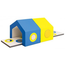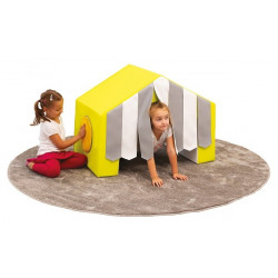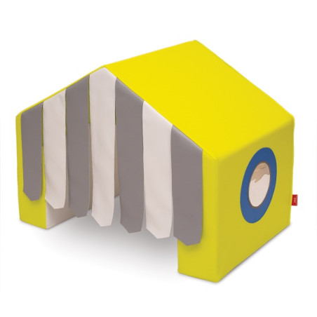 UUn tunnel a forma di casetta è un luogo ideale per attività motoria e socializzazione. Può anche servire come angolo di relax dove la privacy necessaria è garantita da una tenda bicolore. Le pareti laterali hanno un cerchio di velluto e uno specchio. Realizzata con imbottitura in poliuretano espanso di ALTA DENSITA', rivestita in morbido similpelle colorato, atossico, antibatterico e lavabile. Dim. cm 92x60x74, specchio diam. 18 cm, cerchio di velour diam. 27 cm.