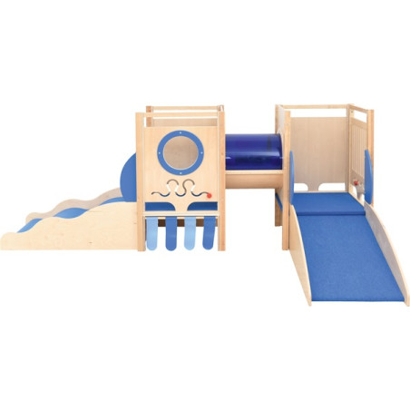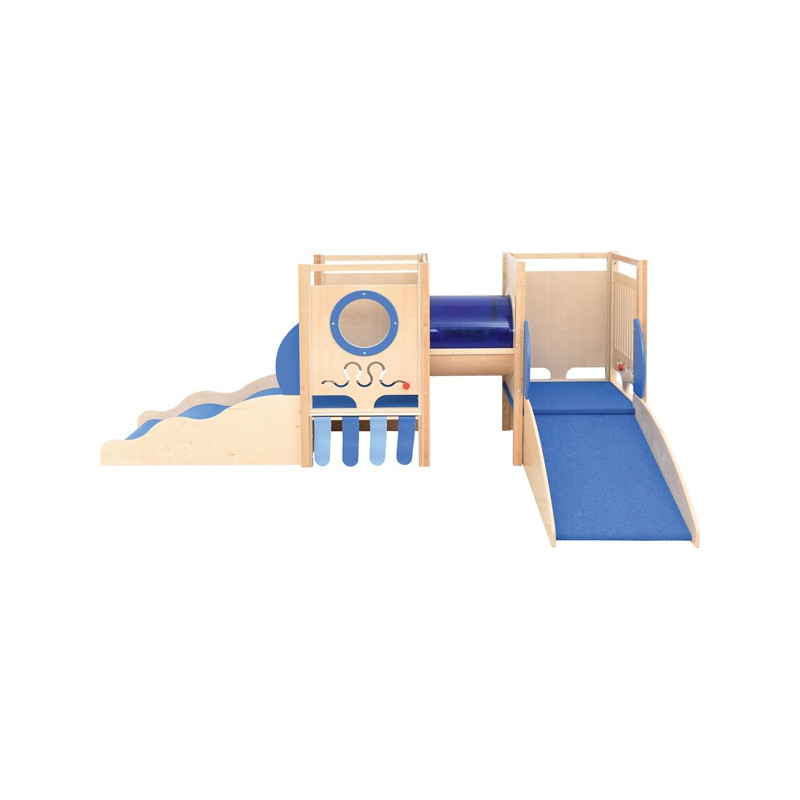 Realizzato in multistrato e nobilitato laminato. E' dotato di un tunnel rivestito in plexiglass trasparente blu, di un modulo con un materasso ad onda, di un modulo salita/discesa, di 2 pannelli sensoriali labirinto e di un oblò. Il modulo salita/discesa e le pedane sono rivestite con moquette.