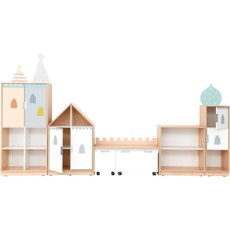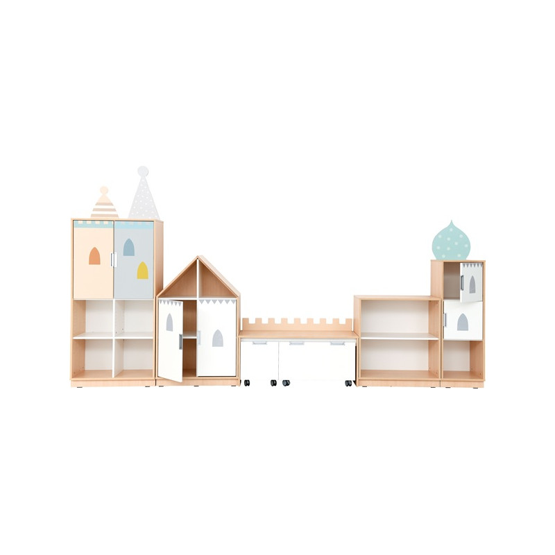 Composizione Castello composta da elementi funzionali con frontali decorativi progettati per organizzare diverse aree tematiche. Struttura realizzata in pannello laminato spessore 18 mm, finitura acero. Frontali spessore 18 mm rivestiti con impiallacciatura termoplastica resistente. Ante con cerniere apertura 90°, Sistema di chiusura ammortizzata.