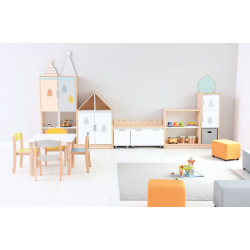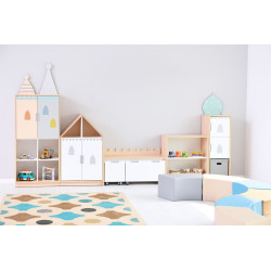 Composta da: -Mensola XL con divisorio e 3 ripiani; -Mobile a forma di casa con 2 ripiani; -Panca per 3 piccole cassapanche; -Mobile M con 1 ripiano su zoccolo; -Mobile colonna a L con 2 ripiani. Dim.: 396,20×41,50x217,60 cm