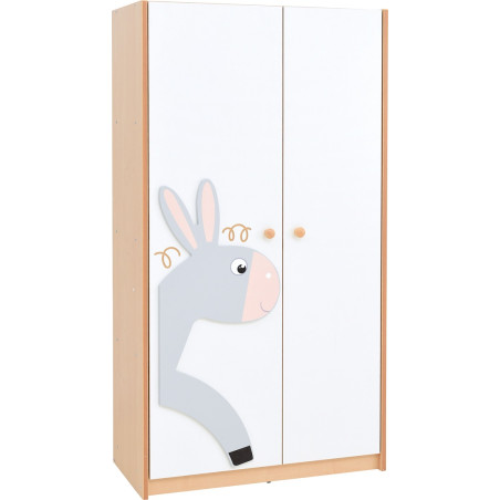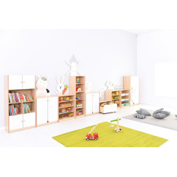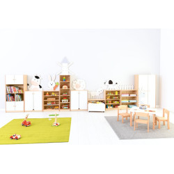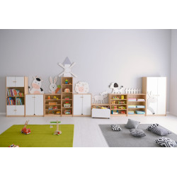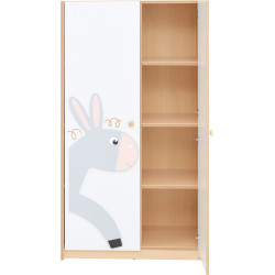 Mobile con applicazione colorata, adatto per riporre raccoglitori, completa la composizione fattoria. È dotato di un divisorio e 3 ripiani su ciascun lato. Realizzato in pannello laminato da 18 mm di spessore in tonalità betulla. Le ante sono realizzate in MDF laminato bianco da 16 mm di spessore. L'applicazione sulle ante è realizzata in pannello laminato da 12 mm di spessore. Dim.: 82,50x40x156 cm.
