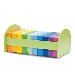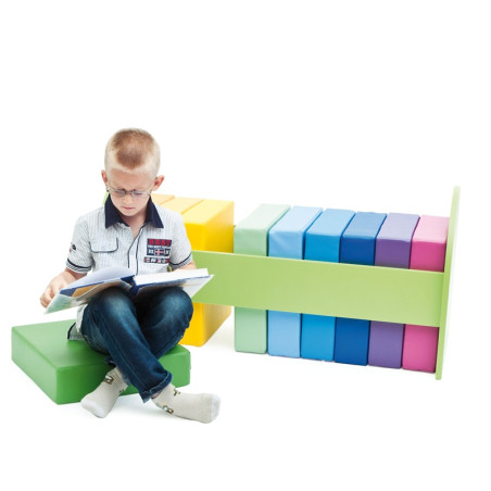10 coloratissimi cuscini per rendere confortevole il gioco, la lettura o guardare uno spettacolo. Realizzati in poliuretano espanso con rivestimento in resistente ecopelle colorata, lavabile, duratura, piacevole al tatto, atossica, antibatterica e antimuffa. Dim. 30x30x10h cm. Sono raccolti in un comodo contenitore in legno, che favorisce autonomia dei bimbi. Quando è riempito di cuscini può servire da divanetto. Dim. mobiletto cm 108x43x40h.