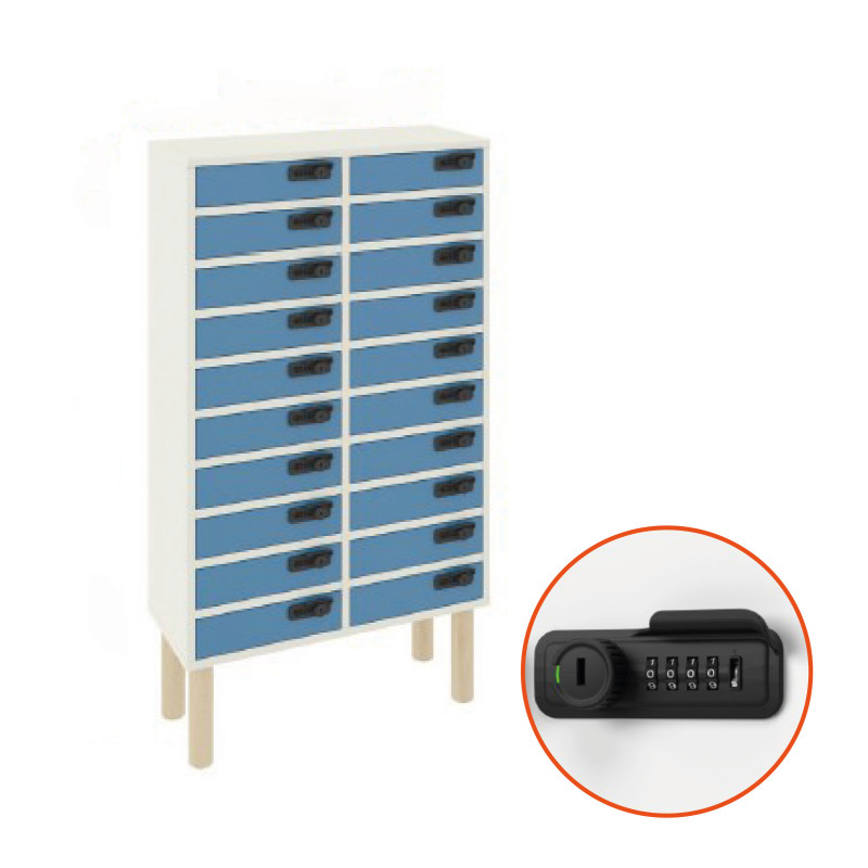 I nuovo armadio contenitore con 20 caselle studiate per custodire cellulari e tablet. Dotato di sistema di chiusura con serratura a combinazione per uso pubblico, ma disponibile anche nella versione con serratura lucchettabile.