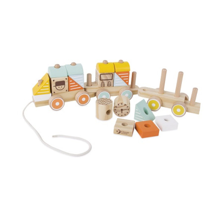 Il treno è composto da 17 mattoncini di varie forme e colori. Ogni carrozza ha una forma diversa. La trama incisa al laser sugli elementi di manipolazione stimola ulteriormente il senso del tatto e supporta lo sviluppo cognitivo dei bambini. Le forme rimovibili sviluppano la creatività e migliorano le capacità motorie. Il bambino può disporre i blocchi in qualsiasi modo, progettando il proprio treno. I blocchi di legno consentono lo sviluppo della manualità, dell'immaginazione spaziale e la capacità di creare le prime strutture. La corda attaccata facilita lo spostamento del treno.