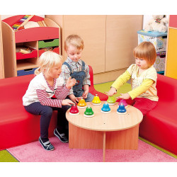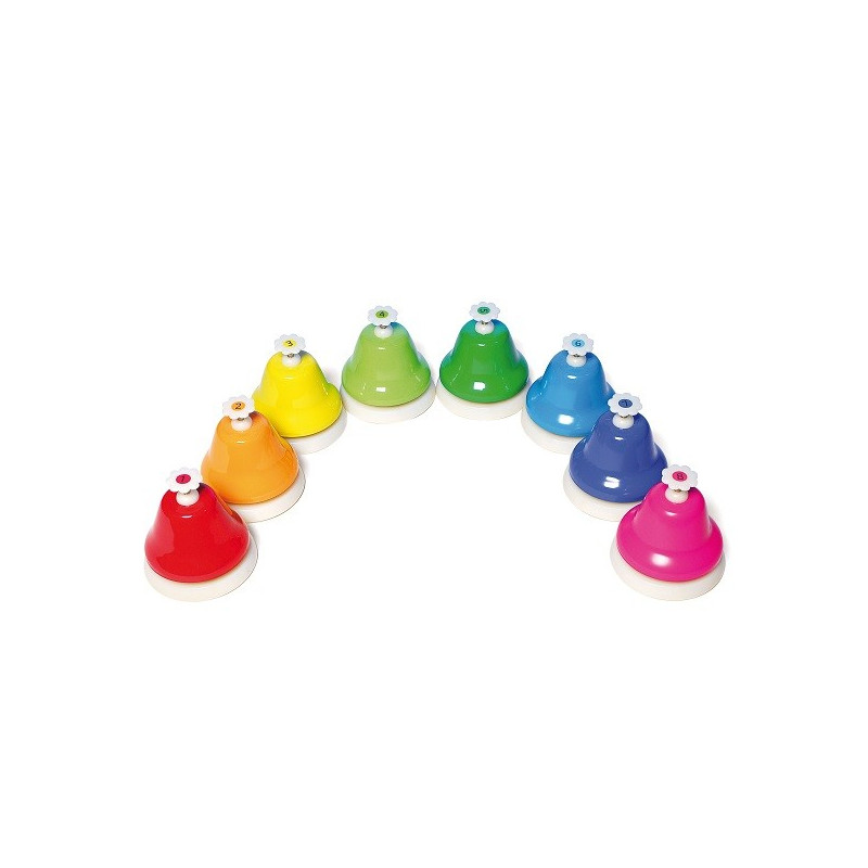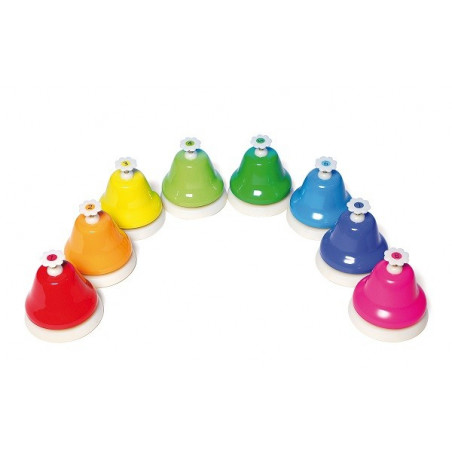 Set 8 campanelli intonati in scala diatonica, differenziate per colore e contrassegnate con le note. Alta risonanza e resistenza. Realizzate in metallo.