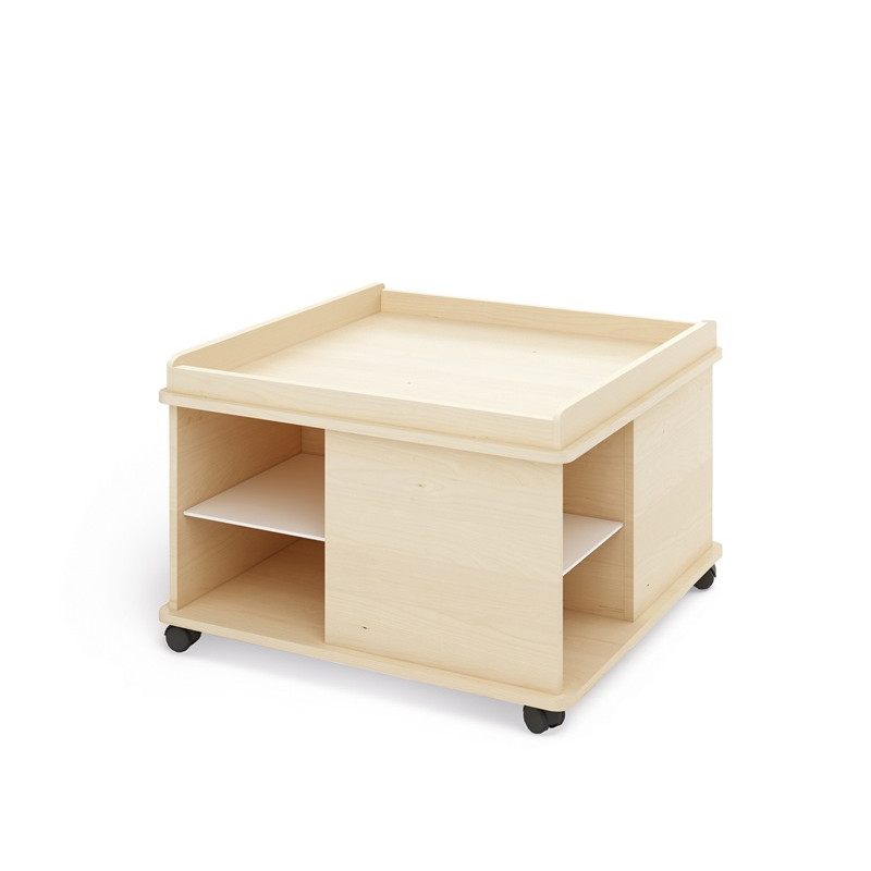 Mobile su 4 ruote con freni e 4 vani a giorno che possono essere attrezzate con anta con ripiano e/o vaschette di plastica: 8 grandi (cod. AA65) oppure 16 piccole (cod. AA66) da acquistare separatamente. Permette di giocare sul suo piano, trattenendo i giocattoli con bordi rialzati e poi facilmente riordinare. Il tappeto City Road (AD67 da acquistare separatamente) rendere il piano ideale per gioco con le macchinine. Realizzato in conglomerato nobilitato ligneo spessore 18 mm, cl. E1, placcato con laminato plastico, finitura betulla. Spigoli arrotondati e bordi rifiniti con ABS antinfortunistico in tinta. Dim. cm 83x83x53h.