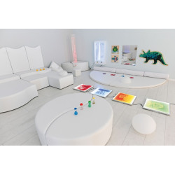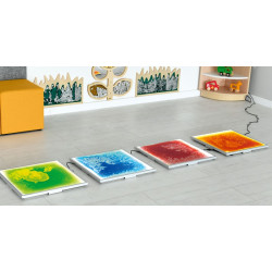 Il pannello contienene sostanze oleose liquide di color verde e si illumina creando un bellissimo effetto in una stanza oscurata. Toccando la supeficie dei pannelli con i mani o piedi, i liquidi cambiano le forme, si spostano e mischiano tra di loro, fornendo un interessante esperienza visiva e creativa. Il pannello è dotato di un alimentatore e di un cavo per collegare le piastrelle tra loro. Il pannello ha una dimensione di 50 x 50 x 5h cm.
