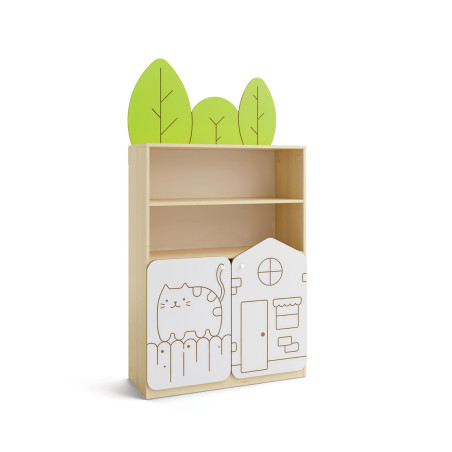 Realizzato in conglomerato nobilitato ligneo di classe E1 con 2 ante e decori in MDF laminato, sagomato e decorato con simpatiche pantografie. Dim. 100x40x140h cm, altezza totale con decoro 194 cm.