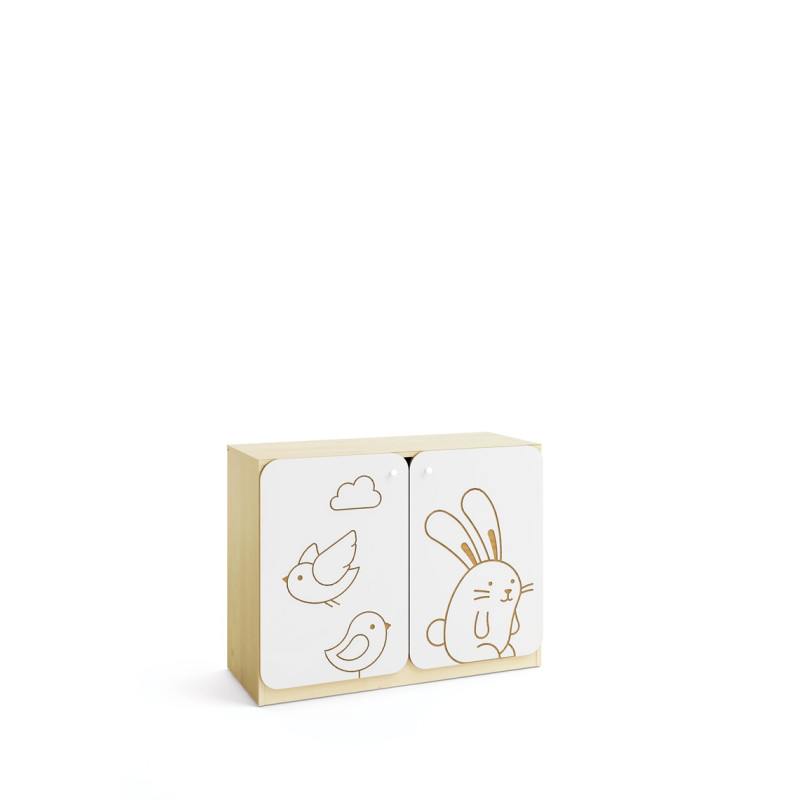 Mobile basso realizzato in conglomerato nobilitato ligneo di classe E1 con ante in MDF laminato, sagomato e decorato con simpatiche pantografie. Dim. cm 100x40x76h.