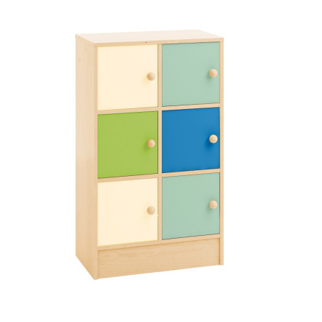 Mobile con antine in MDF laminato di spessore 12 mm e ripiano interno in MDF sp. 5 mm, regolabile in altezza. Struttura realizzata in conglomerato nobilitato ligneo, sp. 18 mm, bordi in ABS, cl. E1, finitura betulla. Armadietti funzionali e facilmente assegnabili ad ogni elemento del gruppo. Lo schema con ante dai colori pastello, aiuta ogni bambino a distinguere la casella assegnata. Dim. cm 66,5x35x113h.