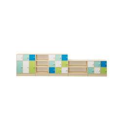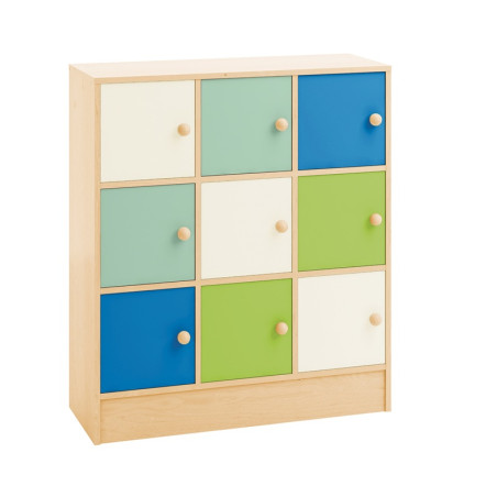 Mobile con antine in MDF laminato di spessore 12 mm e ripiano interno in MDF sp. 4 mm, regolabile in altezza. Struttura realizzata in conglomerato nobilitato ligneo, sp. 18 mm, bordi in ABS, cl. E1, finitura betulla. Armadietti funzionali e facilmente assegnabili ad ogni elemento del gruppo. Lo schema con ante dai colori pastello, aiuta ogni bambino a distinguere la casella assegnata. Dim. cm 99x35x113h.
