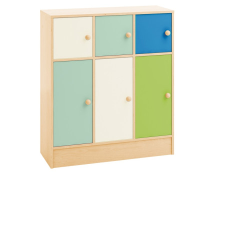 Mobile con 6 antine in MDF laminato di spessore 12 mm, ripiani interni in MDF sp. 4 mm, regolabili in altezza. Struttura realizzata in conglomerato nobilitato ligneo, sp. 18 mm, bordi in ABS, cl. E1, finitura betulla. Armadietti funzionali e facilmente assegnabili ad ogni elemento del gruppo. Lo schema con ante dai colori pastello, aiuta ogni bambino a distinguere la casella assegnata. Dim. cm. 99x35x113h.