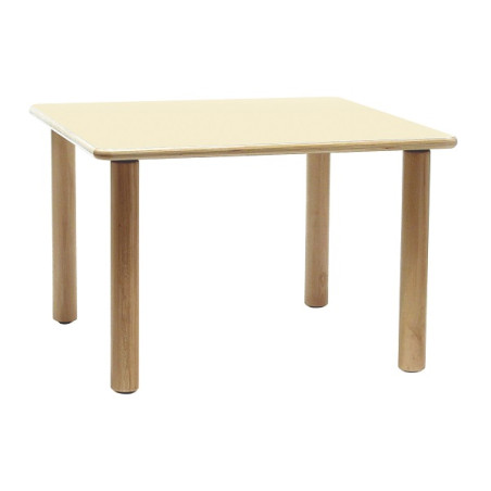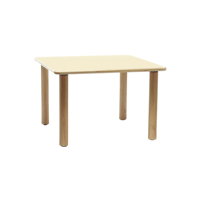 Piano in multistrato di betulla di sp. 22 mm, placcato con laminato plastico di sp. 0,9 mm in finitura opaca, antiriflesso, lavabile e antigraffio. Bordi ed angoli arrotondati, lucidati al naturale. Gambe cilindriche in legno massello di faggio, diam 60 mm, con feltrini antirumore. Colori disponibili: faggio, magnolia, azzurro pastello, giallo, arancio, verde e verde pastello. Dim. cm. 60x60x64h.