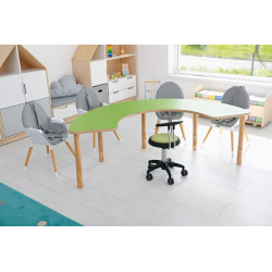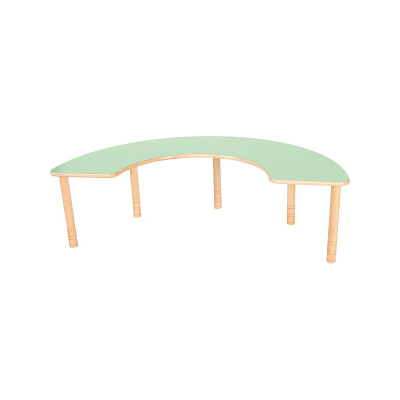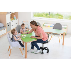 Tavolo fino a 6 posti che permette di creare uno spazio funzionale per giocare e lavorare. Piano realizzato in conglomerato nobilitato ligneo, spess. 25 mm, placcato su entrambe le facce con laminato plastico lavabile, antigraffio e antiriflesso, finitura faggio, con bordo antinfortunistico in ABS. Gambe in legno massello tornito, verniciato al naturale, di diam. 43 mm, con altezza regolabile di 40-46-52-58 cm, grazie agli appositi aggiunti che permettono di adattare il tavolo al bambino, garantendo il massimo conforto. Dim. cm 197x90.